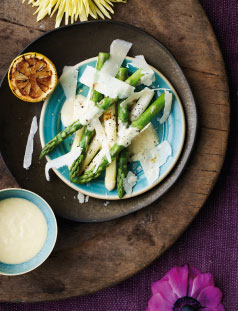 Kog lidt vand op i en høj, dyb pande. Tilsæt smør og salt, og damp aspargesene under låg i 1 minut. De må meget gerne have bid. Dræn vandet fra. Anret aspargesene på fire tallerkener eller et stort fad, og servér med cærsardressing og ristede citroner.